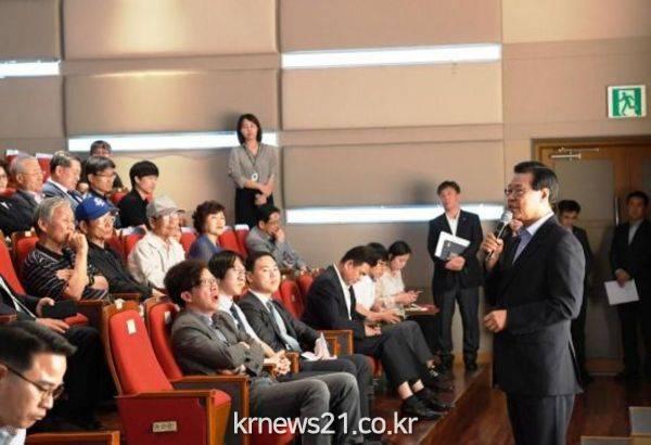 지난해 6월 용산아트홀 소극장에서 열린 ‘용산공원 공론장’에서 성장현 용산구청장이 주민 질문에 답하고 있다.