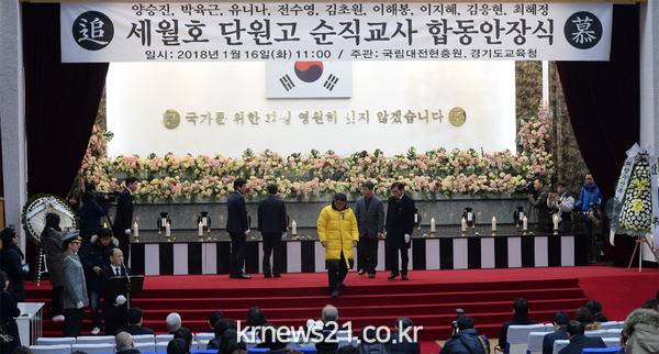 합동 안장식은 유족을 비롯해 강영순 경기교육청 제1부교육감과 이용균 대전시교육청 부교육감, 양동영 단원고 교감, 김민종 해양수산부 세월호후속대책추진단장, 동료 교사, 세월호 관련 시민단체 관계자 등이 참석한 가운데 엄수됐다. 이재정 경기교육감은 강 부교육감이 읽은 추모사에서 “한 아이라도 더 구하려고 애쓴 그 간절함은 단순한 말로 표현할 수 없을 것”이라며 “선생님들의 희생은 우리 교육을 바꾸는 시작이 될 것”이라며 고인들의 희생정신을 기렸다.