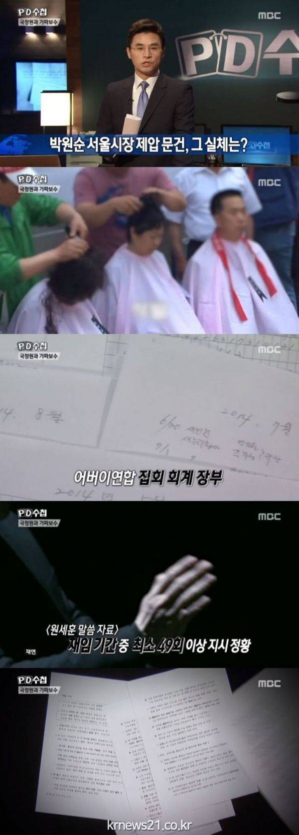 이날 방송에서 공개된 어버이연합 집회 회계 장부에는 삭발식 다음 날 돈을 주고받은 구체적인 정황이 담겨 있으면 삭발식과 관련해 현금 200만 원을 받은 사람의 이름도 적혀있었다. 탈북인단체총연합회 회장은 "박원순을 타도하면서 사람들을 집회에 동원하고 삭발하고 그것을 다 돈 주고 진행했다"고 전했다.