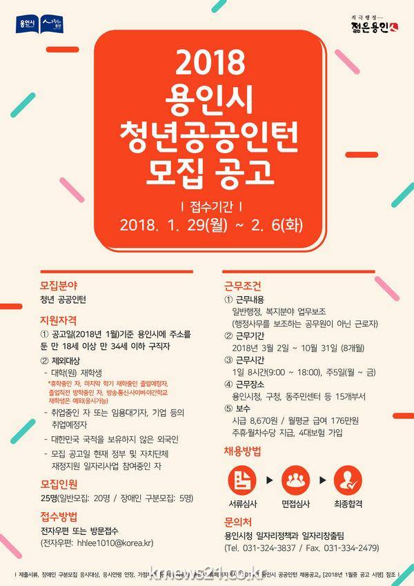 신청은 용인시청 홈페이지 고시공고에서 응시원서를 다운받아 작성한 후 증빙서류와 함께 이메일이나 시청 일자리정책과로 제출하면 된다. 최종합격자는 서류전형과 면접시험 등을 거쳐 2월 23일 발표한다.