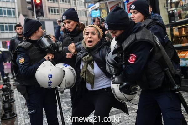 ▲ AFP / OZAN KOSE [제공자ⓒ 뉴스21통신. 무단전재-재배포 금지.]경찰이 시리아의 올리브 가지 작전에 항의하기 위해 이스탄불에서 시위 중인 여성을 체포하는 모습.