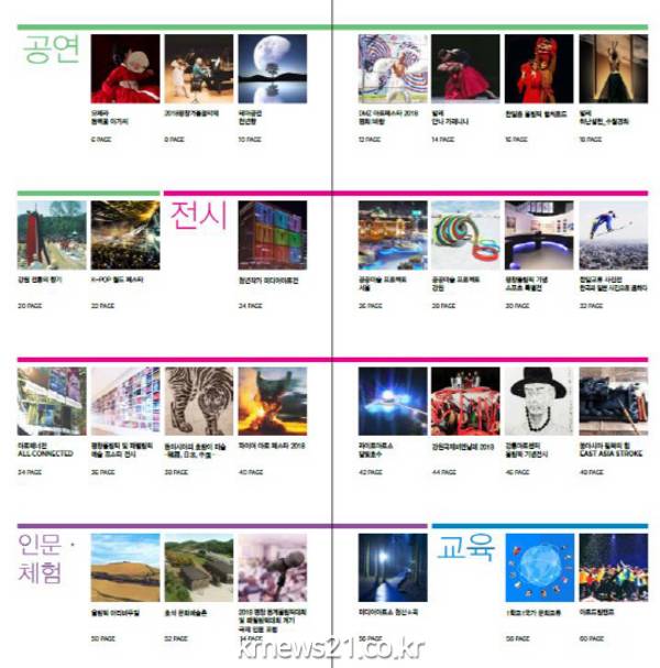 이번 책자에서는 평창 동계올림픽·패럴림픽을 전후로 다채롭게 펼쳐질 문화올림픽을 크게 △공연 △전시 △인문·체험 △교육 △축제 △올림픽 현장 프로그램으로 나눠 분야별 추천 프로그램을 총 100쪽 남짓 걸쳐 소개했다.