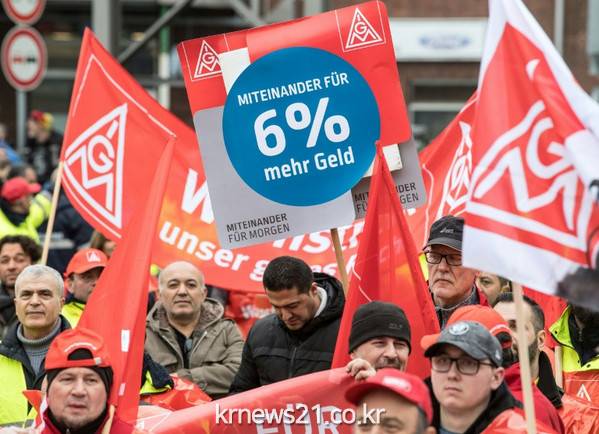 ▲ dpa/AFP / Federico Gambarini [제공자ⓒ 뉴스21통신. 무단전재-재배포 금지.]본격적으로 운영되는 경제에 고무된 독일 경제계의 다른 분야의 근로자들도 임금 인상을 위해 금속 노조의 요구를 따르고 있으며 독일의 무역 상대국들도 이를 부인하고 있다.