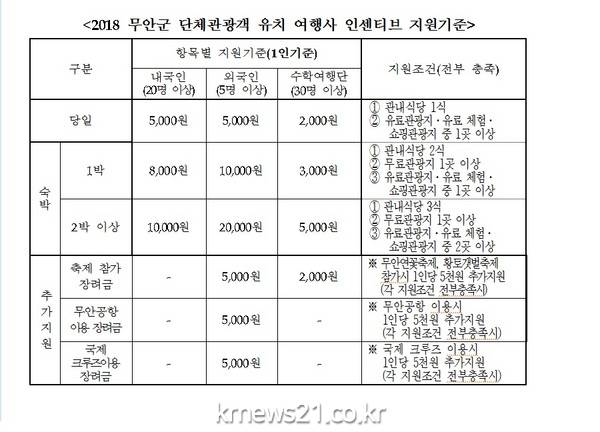 인센티브 지원은 여행사로 등록된 여행업체가 내국인 20명 이상,외국인 5명 이상, 수학여행단 30명 이상을 유치하여 관내에서 숙박과 음식점을 이용하고 관광지를 방문하면 내‧외국인 1명당 5천원에서 2만원을 숙박 일수와 방문경로에 따라 차등 지원하는 사업이다.