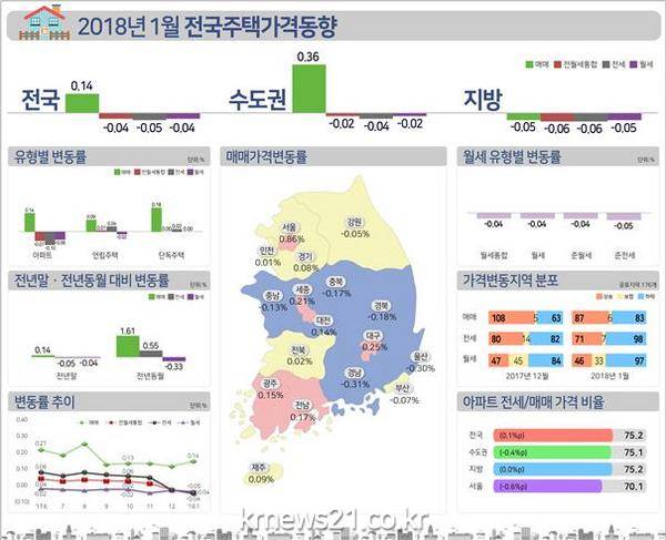 전국 집값은 0.14% 상승해 서울에 비해 6배 낮은 상승률을 기록했다. 전국 전월세 시장은 0.04% 하락을 기록했다.