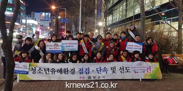 양산시는 지난 1일 양산경찰서, 양산교육지원청, 양산시 청소년선도위원회, 청소년상담복지센터 등 50여명이 참석한 가운데 오후 6시 30분부터 이마트 양산점 인근의 노래연습장, PC방 및 청소년 유해업소를 방문해 캠페인을 펼쳤다.
