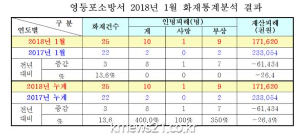 영등포소방서는 안전한 서울을 만들기 위해 2018년 1월 화재통계 분석 결과를 발표 했다.