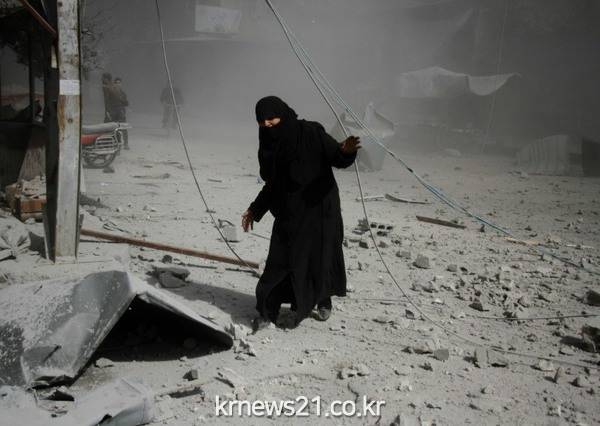 ▲ AFP / Hamza Al-Ajweh[제공자ⓒ 뉴스21통신. 무단전재-재배포 금지.]시리아 정부군에게 포위된 구타(Ghouta) 동부 지역 두마(Duma)에서 정부군의 공습이 지나간 후 잔해속을 걷고 있다. 영국에 본부를 둔 시리아내전 감시단체 '시리아인권관측소'(SOHR)는 7일(현지시간) 이번 공습으로 주민 32명이 목숨을 잃었고 이중 10명은 어린이로 파악됐다고 밝혔다.