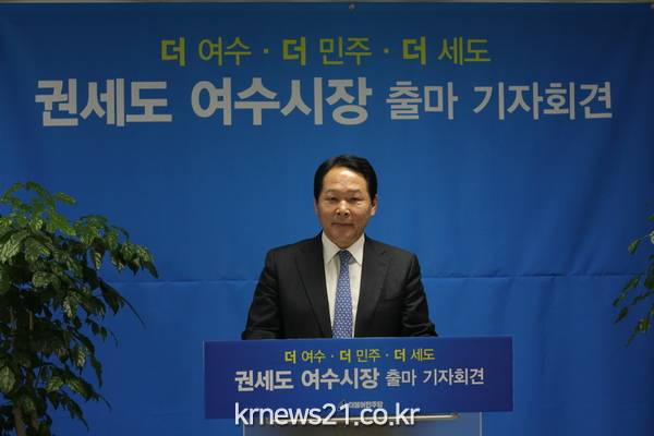 더불어민주당 조선대학교 권세도 초빙교수가 2월 8일(목) 오후 14시 여수시청 브리핑룸에서 기자회견을 갖고 돌아오는 6월에 실시하는 여수시장 출마를 공식 선언했다.