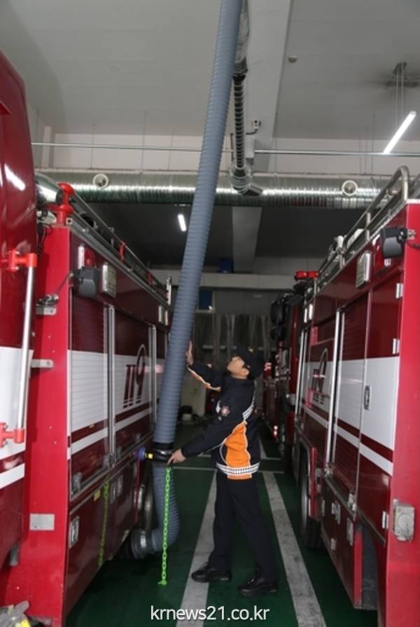 영등포소방서는 출동과 각종 훈련, 점검 등으로 발생하는 배기가스로부터 직원을 보호하고 차량에서 발생하는 미세먼지 등 환경상 위해 예방을 위해 차고내 매연배출 저감장치를 설치하고 시범운영을 시작했다.