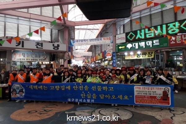 대구 달서소방서(서장 이상훈)는 12일 오후 2시경 소방공무원과 의용소방대, 119시민안전봉사단 120여 명이 달서구에 있는 상인동 롯데백화점 앞, 달서시장을 방문해 설 명절 귀성객 대상으로 화재 예방 홍보 캠페인을 벌였다.