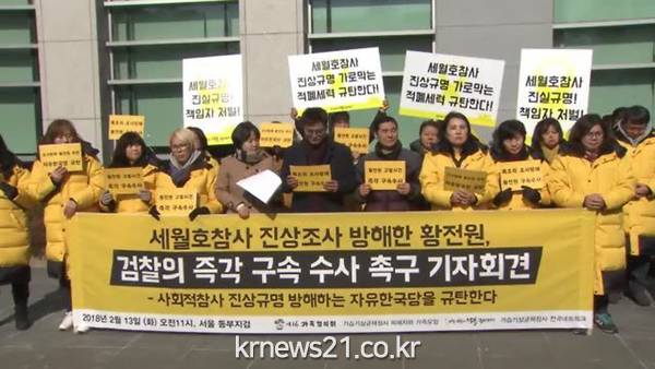 4·16세월호참사가족협의회, 4월16의약속국민연대, 가습기살균제 피해자와 가족모임은 이날 서울동부지검 앞에서 기자회견을 하고 "세월호 참사 진상조사를 방해한 혐의로 고발당한 황 전 위원은 특조위원이 될 자격이 없다"고 주장했다.