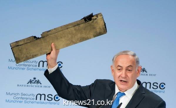 ▲ MSC Munich Security Conference/AFP / Lennart PREISS[제공자ⓒ 뉴스21통신. 무단전재-재배포 금지.]베냐민 네타냐후 이스라엘 총리가 18일(현지시간) 뮌헨안보회의 연설에서 격추된 이란 드론의 파편을 들고 있다. 지난 16일(현지시간)부터 18일까지 열린 뮌헨 국제안보회의(Munich Security Conference)에서 네타나후 총리는 17일 연설에 나서 시리아에서 격추한 이란의 무인 정찰기(드론) 조각이라는 것까지 꺼내며 이란을 비난했다. 몇 시간 뒤 자리프 이란 외무장관은 이어 가진 연설에서 이스라엘을 맞비난했다. 자리프 장관은 네타냐후 총리가 상황을 고의적으로 확대하며 거의 매일같이 시리아 상공을 급습하고 있다고 비판했다.