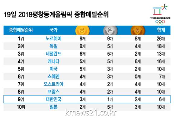 2018 평창 동계올림픽 순위에서 한국은 9위, 일본은 10위다. 일본은 18일 스피드스케이팅 여자 500m에서 고다이라 나오가 금빛 질주를 펼쳤다. 이번 대회 두 번째 금메달을 획득한 일본(금2 은5 동3)은 한국(금3 은1 동2)을 금메달 1개차로 바짝 뒤쫓았다.