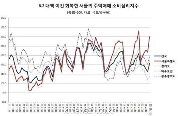 서울의 매매 소비심리는 작년 8·2 부동산 대책이 발표되기 전인 7월 156.2에서 8·2 대책이 나온 8월 123.3으로 추락했다.