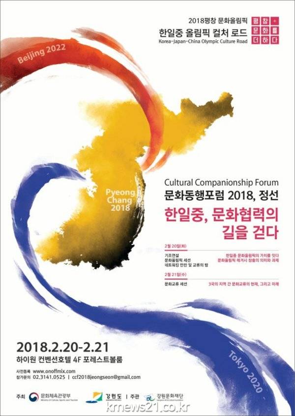 강원도 전역에서 펼쳐지는 다양한 문화올림픽 사업 중 하나인 ‘문화동행포럼 2018, 정선’은 2018 평창 동계올림픽, 2020 도쿄올림픽, 2022 베이징 동계올림픽 등 올림픽이라는 공통된 이슈 속에서 한일중 3국의 관련 분야 전문가와 실무자들이 함께 모여 3국 공동의 문화 레거시를 위한 로드맵을 제시하는 자리라는 점에서 그 의미가 깊다.