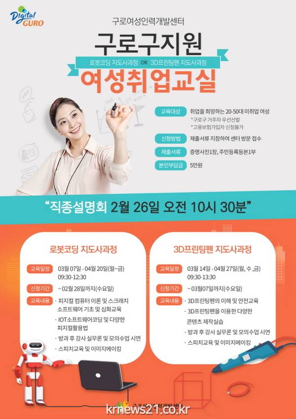 구로구 지원으로 진행되는 이번 여성취업교실은 취업을 희망하는 20-50대 미취업 여성이면 누구나 참여 가능하며, 과정은 ‘로봇코딩 지도사과정’과 ‘3D프린팅펜 지도사과정’으로 마련됐다.