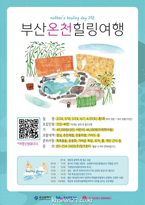 부산시와 부산관광공사는 오는 24일부터 4월 21일까지 격주 토요일 마다 '엄마에게 주는 휴가'라는 컨셉으로 '부산온천 힐링여행 시즌2’ 프로그램을 운영한다고 21일 밝혔다.