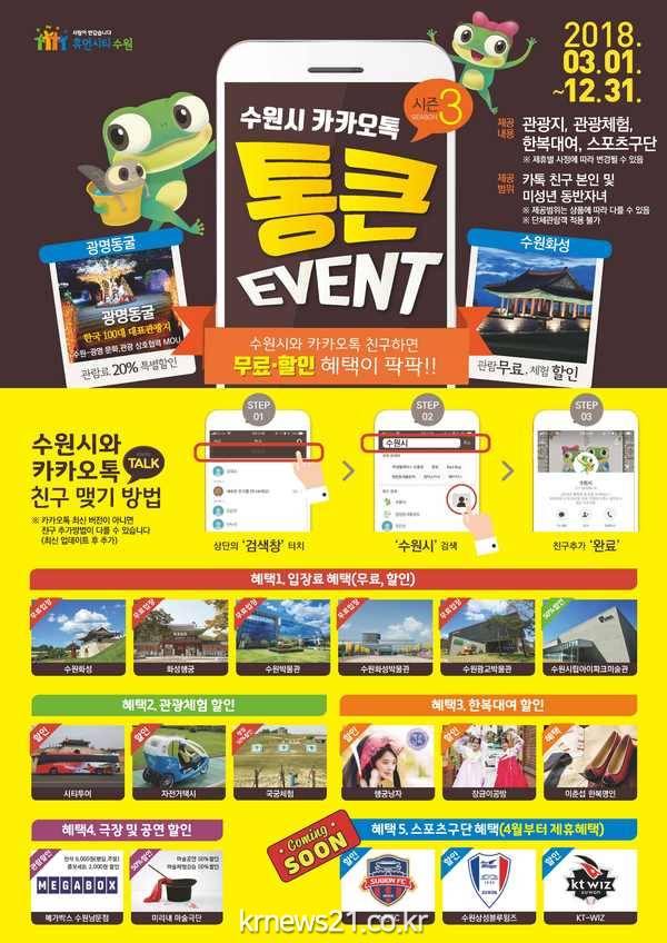 2016년부터 매년 ‘카톡 친구 통 큰 이벤트’를 펼쳐 호응을 얻었던 수원시가 3월 1일부터 혜택이 대폭 늘어난 ‘통 큰 이벤트 시즌3’를 시작한다. 모바일 메신저 카카오 톡에서 ‘수원시’와 친구를 맺으면 주요 관광지, 박물관, 관광체험 시설 등을 무료·할인 가격으로 이용할 수 있는 이벤트다.