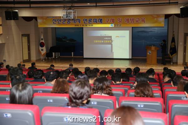 (뉴스21/장병기기자)=신안군은 2018.02.26.(월) 본청 직원 200여명은 공연장에서 읍‧면직원은 영상시스템을 통해, 대 언론 관계 관리 및 오보 대응 등 위기관리 역량을 강화하기 위해 언론피해 구제 및 예방 교육 전문 강사를 초빙하여 전 공직자를 대상으로 실시했다고 전했다.