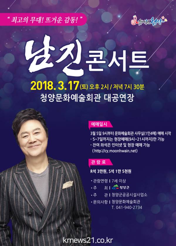 청양군이 내달 17일 문예회관 대공연장에서 ‘2018 남진 콘서트’를 개최한다.