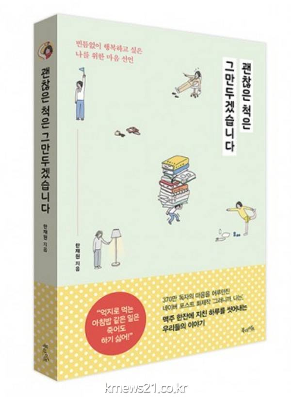 도망치고 싶지만 현실에 머물 수밖에 없어 서글플 때, 아무것도 하기 싫어 무기력해질 때, 그럼에도 다시 힘을 내 집밖을 나서야 할 때 한재원 작가가 차곡차곡 쌓은 기록들과 니나킴의 감각적인 일러스트가 더해진 ‘괜찮은 척은 그만두겠습니다’는 아직 삶이 서툰 청춘들에게 따뜻한 온기를 전한다.