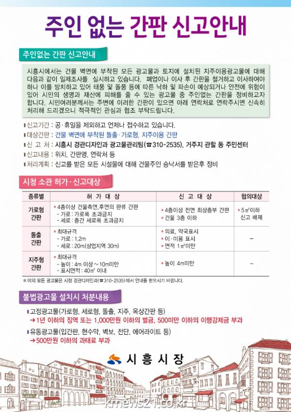 시흥시(시장 김윤식)는 28일부터 3월15일까지 주인 없는 간판 일제정비를 실시한다고 밝혔다.