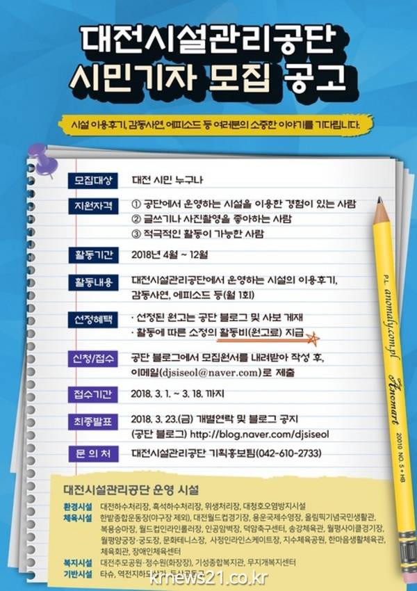 대전시설관리공단은 시민과의 소통을 활성화하기 위해 ‘대전시설관리공단 시민기자단’을 모집한다고 28일 밝혔다.
