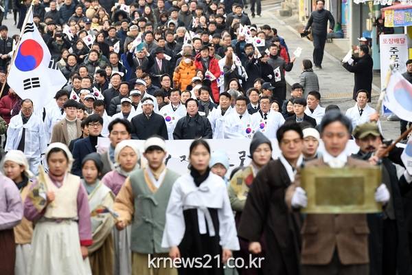 이날 오전 9시 기념탑 참배로 시작 된 행사는 3·1운동 기념탑에서 광주시 노인복지회관까지 거리행진을 하며 장관을 이뤘다. 거리행진은 대형태극기를 선두로 일본헌병과 독립투사들로 분장한 공연단원들이 거리 곳곳에서 퍼포먼스를 펼쳤으며 일제의 폭압에 굴하지 않고 독립을 외치는 당시 상황을 재현해 시민들의 눈길을 끌었다.