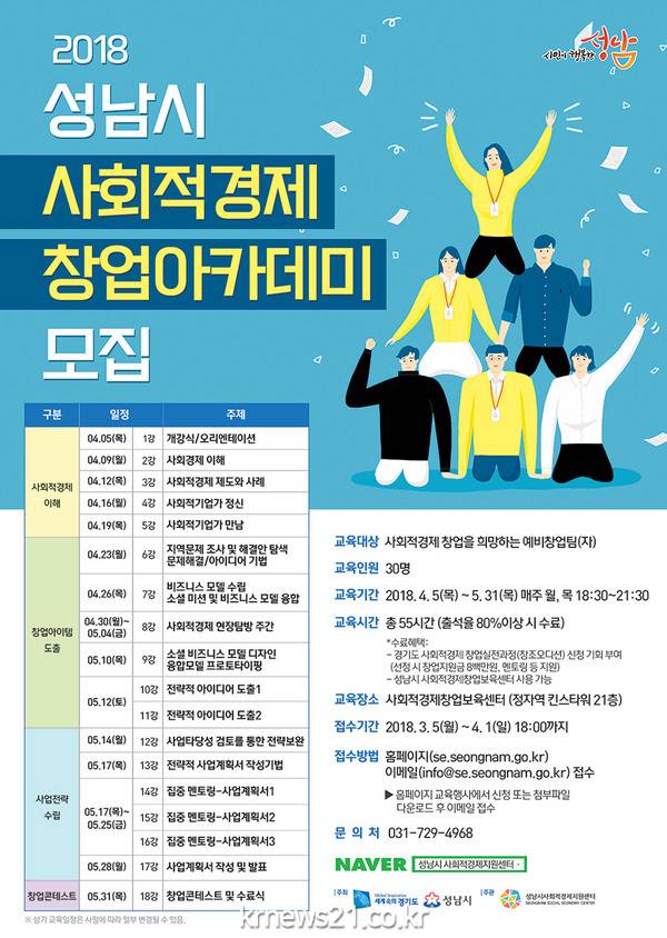 성남시는 사회적 경제기업을 창업하려는 이들을 위한 아카데미를 마련해 오는 4월 1일까지 수강생 30명을 모집한다.