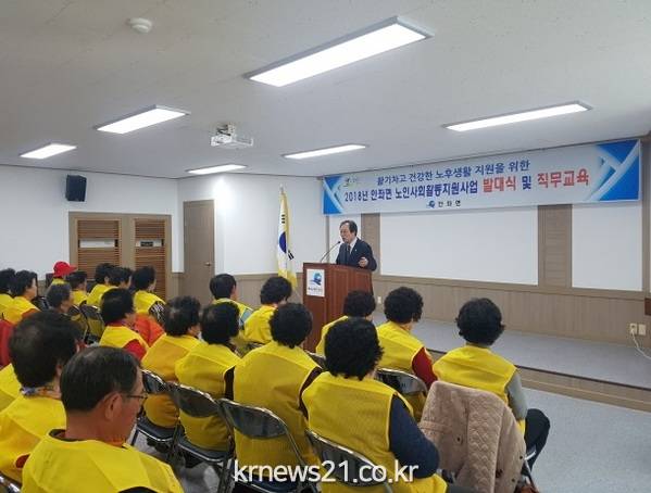 (뉴스21/장병기기자)=신안군 안좌면(면장 정승일)은 14일 안좌면사무소 2층 회의실에서 노인사회활동지원(노인일자리)사업에 참여하는 어르신들을 대상으로 발대식과 직무․안전교육을 실시했다.