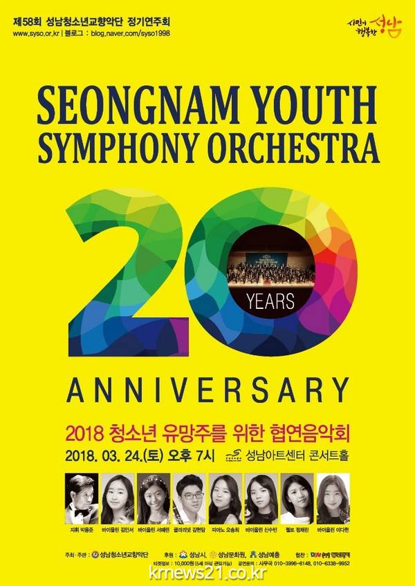 성남청소년오케스트라 창단 20주년 기념, 제 58회 정기연주회를 겸한 이번 공연에는, 미래 음악 유망주인 바이올린 김민서, 서혜린, 신수빈, 이다현. 클라리넷 김현담. 피아노 오송희. 첼로 정채림 단원이 협연하는 무대로, 성남청소년오케스트라가 베토벤 오페라 ‘피델리오 서곡’을 시작으로, 모차르트 바이올린 협주곡 K.216, K.218 의 1악장과, 베버 클라리넷 협주곡 Op.74 1악장, 그리그 피아노 협주곡 Op.16 1악장, 베리오 바이올린 협주곡 발레의 정경 Op.100과 드보르작 첼로 협주곡 Op.104 3악장, 마지막으로 랄로 스페인 교향곡 Op.21 1악장을 연주한다.