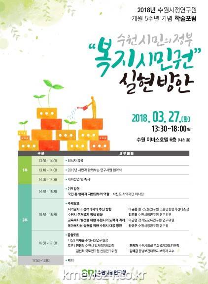 수원시정연구원은 27일 오후 1시 30분 수원 이비스 호텔 니스 홀에서 ‘수원 시민의 정부 ‘복지시민권’ 실현 방안’을 주제로 개원 5주년 기념 학술포럼을 연다.