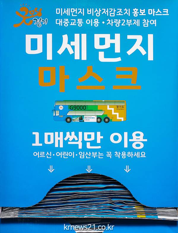 대중교통 이용 활성화를 위해 버스 이용자를 대상으로 미세먼지 마스크도 보급한다. 도는 올해 미세먼지 비상저감 조치 발령시 버스 이용객을 대상으로 미세먼지 마스크 375만매를 무료로 보급할 계획이다. 도는 앞서 지난 26일 미세먼지 비상저감 조치가 발령됨에 따라 도내 간선급행버스 16개 노선 185대에 미세먼지 마스크 1만8000매를 비치, 긴급 배포한 바 있다.