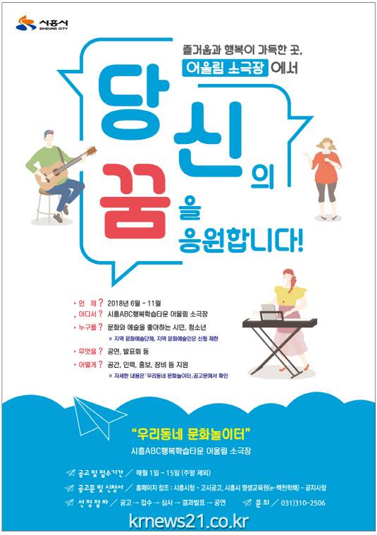 <</span>우리 동네 문화놀이터> 신청을 비롯한 자세한 사항은 시흥시 평생교육원 e-백천학해 홈페이지(eduinfo.siheung.go.kr)에서 확인할 수 있으며, 문의는 평생학습과(031-310-2506)로 하면 된다.