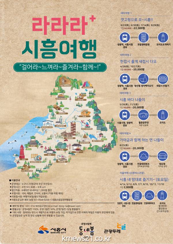 시흥시는 오는 4월부터 매력적인 관광코스로 이루어진 ‘라라라 시흥여행’ 프로그램을 운영하여 시흥시만의 관광자원을 홍보, 적극적인 관광객 유치에 나선다.