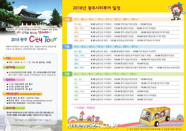 한편, 시티투어 일정은 광주시청 홈페이지에서 확인 가능하며 운영업체인 ㈜로망스투어(02-318-1664)에서 예약하면 된다.
