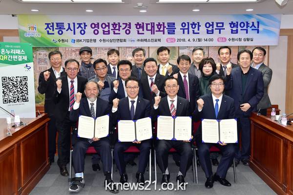 수원시와 IBK기업은행, 수원시상인연합회, ㈜하렉스인포텍은 9일 시청 상황실에서 ‘전통시장 영업환경 현대화를 위한 업무협약’을 체결하고, 모바일 결제 서비스 도입을 위해 적극적으로 협력하기로 했다.