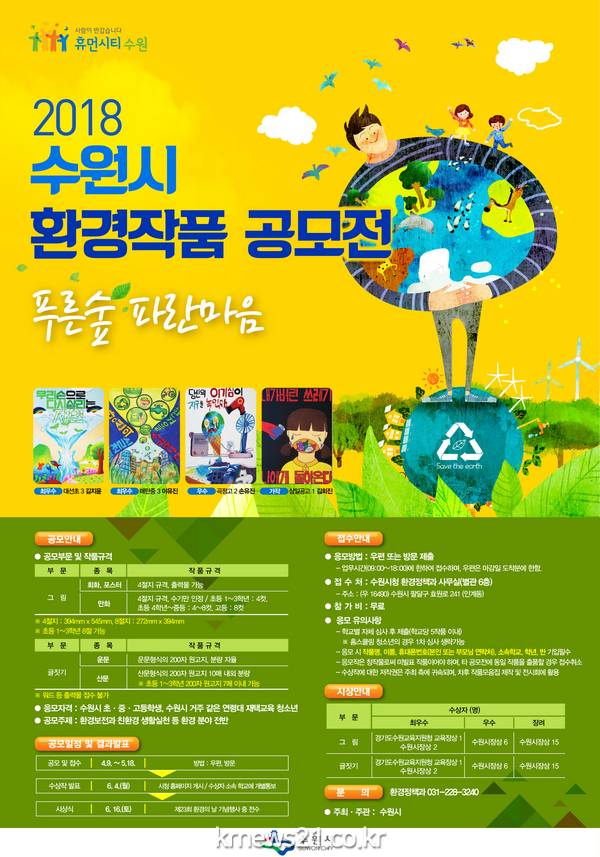 수원시는 제23회 환경의 날(6월 5일)을 앞두고 청소년을 대상으로 환경작품을 공모한다. 응모 기간은 9일부터 5월 18일까지 6주간이다.