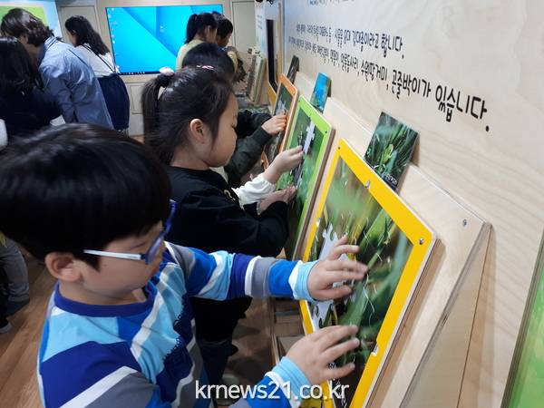 또 교실에서는 미니 컬링경기를 하며 먹이사슬 피라미드를 완성하는 생태체험 프로그램 ‘땅위 생태계 먹이사슬 컬링’이 학생들의 관심을 끌었다.