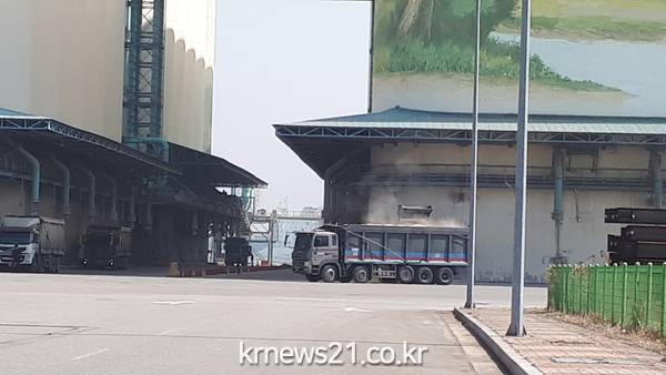 평택항 내의 D곡물 하역업체는 수송차량에서 원료를 싣고 내리는 과정에서 발생하는 비산먼지를 억제하기 위한 적정조치를 하지 않은 채 조업하다가 적발됐다.