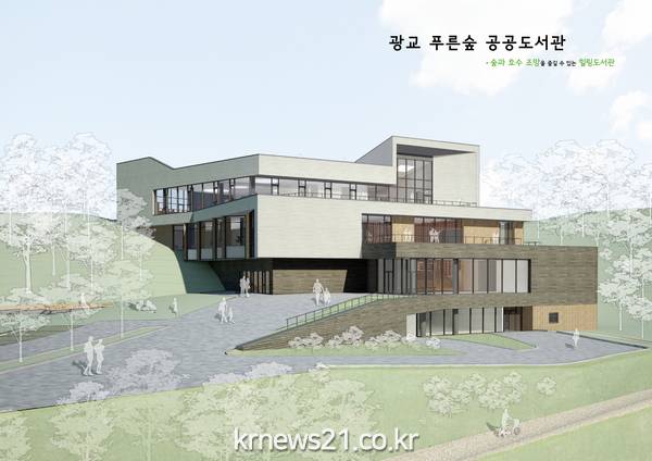 광교호수로 131에 건립된 광교 푸른 숲 도서관은 대지면적 2만㎡, 연면적 4505㎡, 지하 1층·지상 3층 규모다. 지하 1층에는 보존서고, 1층에는 강당·다목적실이 있다.