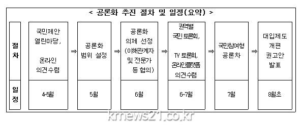 의제가 정해지면 3∼5개 권역별 국민토론회, TV 토론회, 온라인 플랫폼 의견수렴을 먼저 진행하고, 이후에는 대표성을 고려해 구성한 참여자를 중심으로 7월까지 국민참여형 공론 절차를 진행한다.