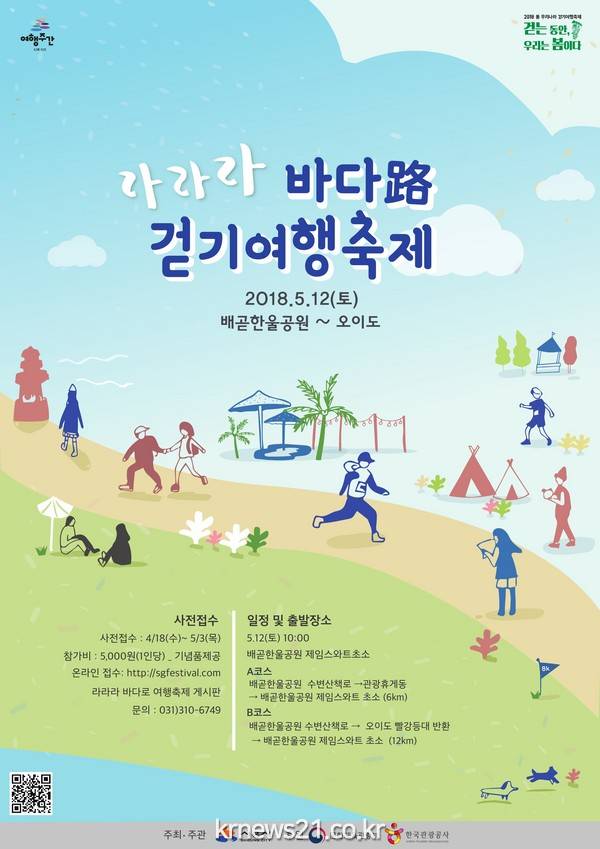 시흥시는 문화체육관광부와 한국관광공사에서 주관한 2018년 봄 우리나라 걷기 여행축제 공모사업에 선정되어 오는 5월 12일(토) 배곧 한울공원과 오이도 일원에서 <</span>라라라 바다路 걷기 여행축제>를 개최한다.
