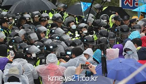 주민 등은 “폭력경찰 물러가라” 등의 구호를 외치며 거세게 저항했다. 이들은 몸에 녹색 그물망을 덮어쓴 채 경찰에 맞섰으며, 일부 주민은 PVC 관에 팔을 넣는 방식으로 ‘인간사슬’을 엮기도 했다. 집회 현장에는 국가인권위원회 직원 3명이 나와 양 측을 중재하고 있다.