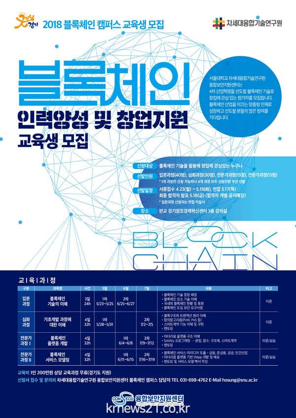 서류는 블록체인캠퍼스 담당자(hosung@snu.ac.kr) 메일로 접수하면 되고, 상세 교육과정은 융합보안지원센터 홈페이지(http://consecu.snu.ac.kr/)에서 확인할 수 있다.