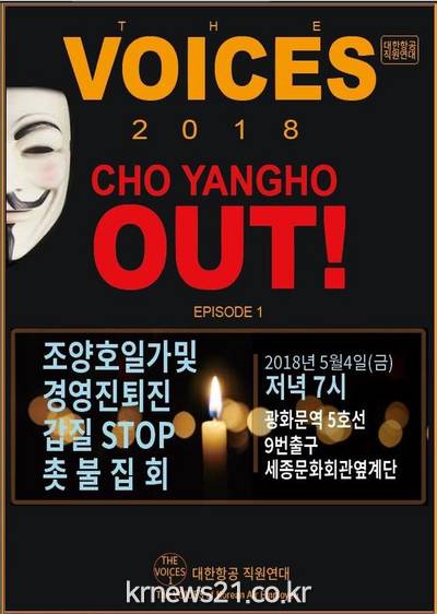 대한항공 직원들이 4일 한진그룹 총수인 조양호 회장 일가의 '갑질'을 규탄하고 조 회장 일가에게 경영 일선 퇴진을 요구하기 위해 촛불집회를 개최한다.