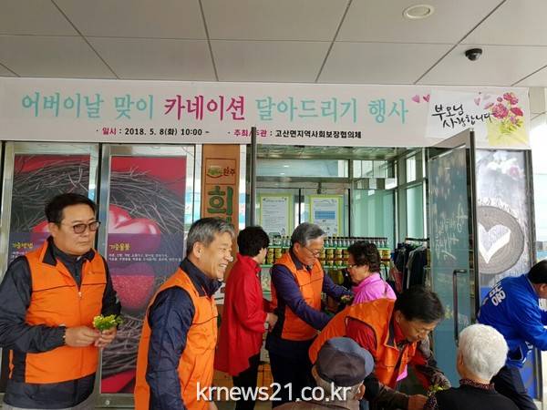 8일 고산면 지역사회보장협의체는 관내 희망나눔가게에 방문한 지역 어르신 50여 명에게 카네이션을 달아드렸다고 밝혔다.