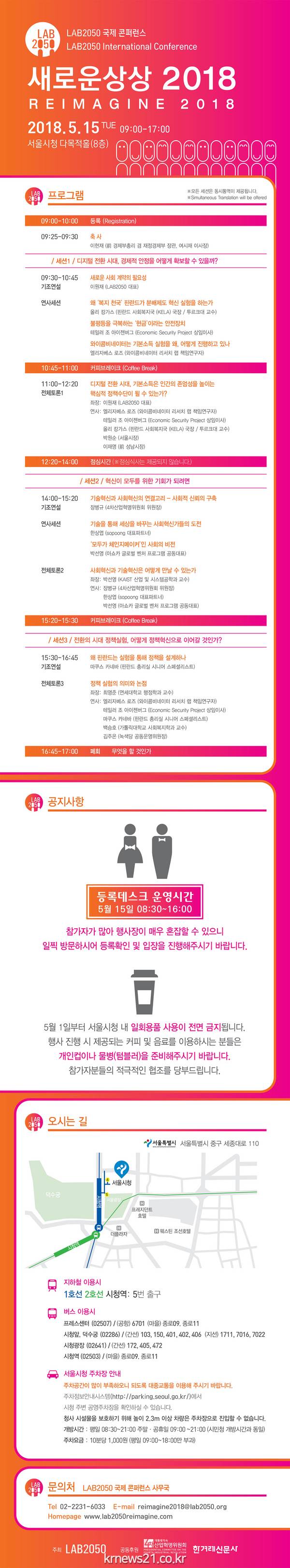 다음세대 정책실험실 LAB2050 (대표 이원재)가 주최하고 대통령 직속 4차 산업혁명위원회와 한겨레신문사에서 공동 후원하는 국제콘퍼런스 ‘새로운 상상 2018 (영문 REIMAGINE 2018)’이 개최된다.