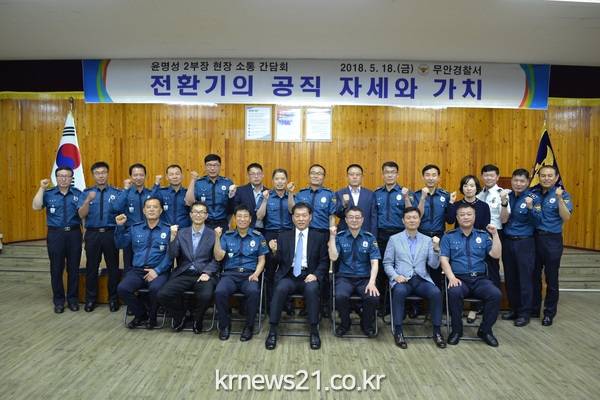 (뉴스21/장병기기자)=윤명성 전남지방경찰청 2부장은 5.18일 무안경찰서에서「전환기 공직 자세와 가치」라는 주제로 이을신 무안경찰서장을 비롯한 각 과·계장 등 직원 70여명이 참석한 가운데 현장간담회를 개최하였다.